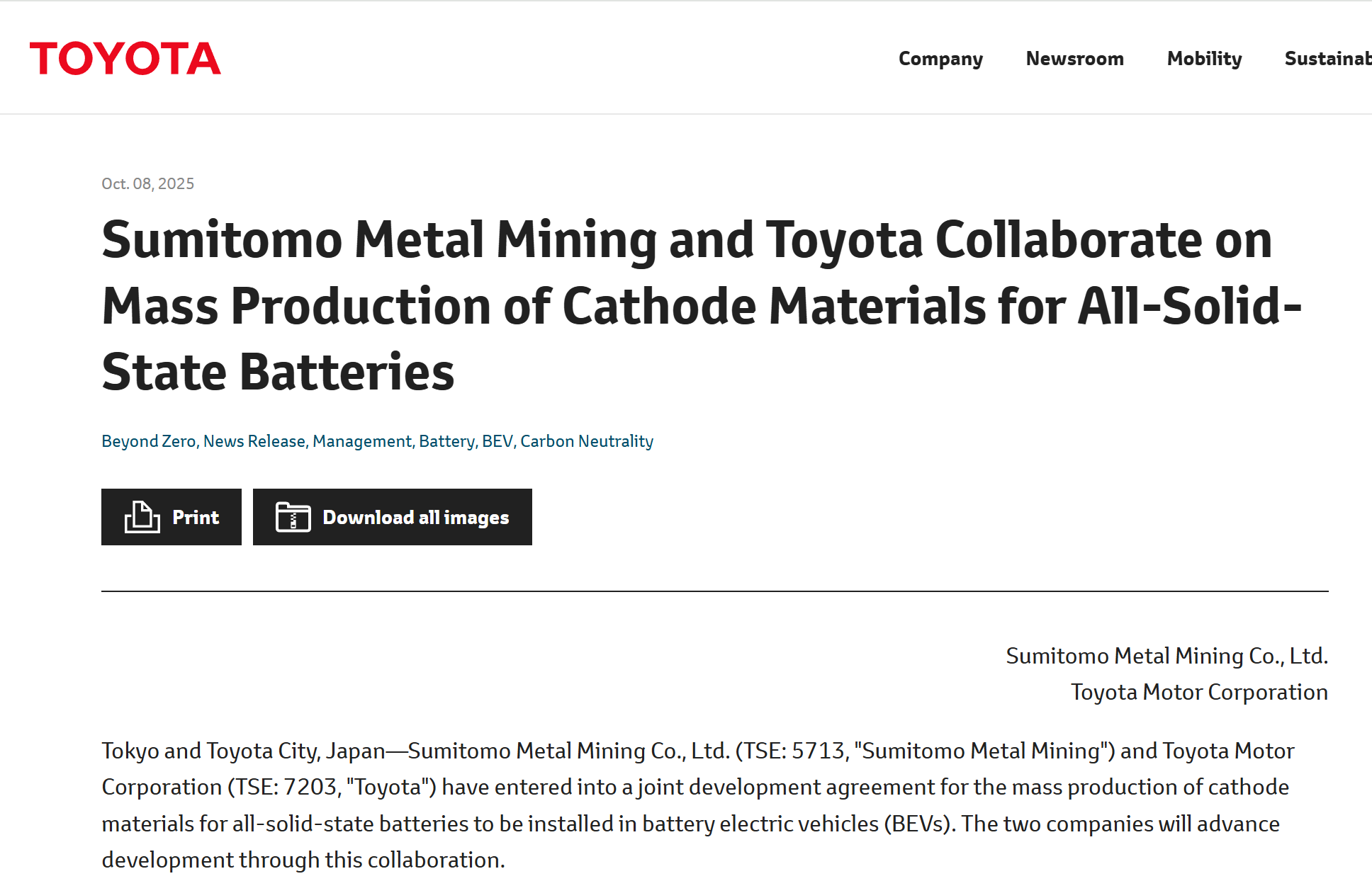 近日,住友金屬礦山與豐田汽車就量產(chǎn)用于純電動(dòng)汽車(BEV)的全固態(tài)電池正極材料達(dá)成合作協(xié)議 ... 查閱全文