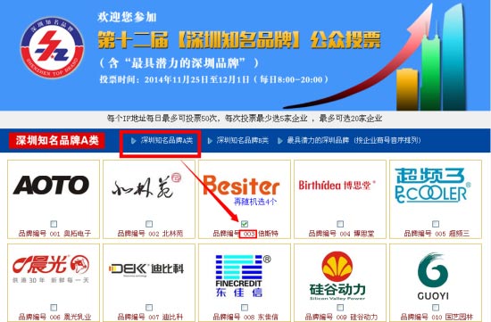 投票時需要輸入投票人姓名,身份證號碼,聯系電話,并點擊選中的品牌編號(003-深圳市倍斯特電源有限公司)對應的投票欄;A類。
