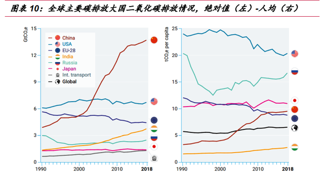 我國減排任務艱巨,年排放量位居世界第一。根據(jù)聯(lián)合國數(shù)據(jù),2018 年中國碳 排放達到 137 億噸,同比增長 1.6%。盡管我國碳排放的增速已經(jīng)放緩,但從總量看, 占全球總排放量的 1/4 以上,仍是全球排名第一的碳排放國。作為世界工廠,在產(chǎn)業(yè) 鏈日趨完善、國產(chǎn)制造加工能力與日俱增的同時,我國的碳排放量也快速攀升。作為 負責任的大國,走低碳節(jié)能發(fā)展之路既是我國的責任所系,亦是使命所向。