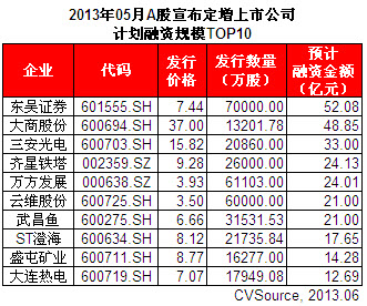 表2 2013年05月A股宣布定增上市公司計劃融資規(guī)模TOP10