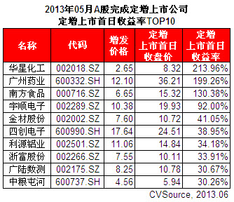 表3 2013年05月A股完成定增上市公司定增上市首日收益率TOP10