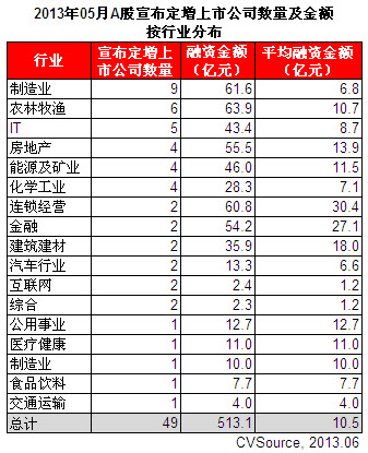 表5 2013年05月A股宣布定增上市公司數(shù)量及金額按行業(yè)分布