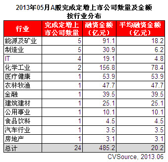 表4 2013年05月A股完成定增上市公司數(shù)量及金額按行業(yè)分布