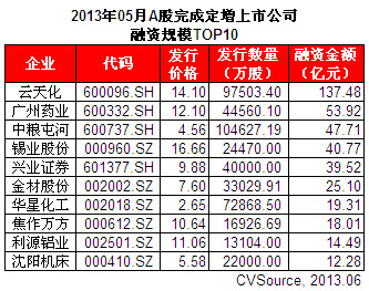 表1 2013年05月A股完成定增上市公司融資規(guī)模TOP10