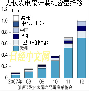 歐洲光伏發(fā)電產(chǎn)業(yè)協(xié)會(huì)(EPIA)日前發(fā)布的數(shù)據(jù)顯示,截至2012年底,全球光伏發(fā)電累積裝機(jī)容量達(dá)到1億200萬(wàn)千瓦,比1年前增長(zhǎng)44%。除了最大市場(chǎng)德國(guó)表現(xiàn)堅(jiān)挺之外,中國(guó)、美國(guó)和日本市場(chǎng)也迅速擴(kuò)大。中國(guó)已超過(guò)美國(guó),在累積數(shù)據(jù)方面躍居世界第3位。全球市場(chǎng)今后有望以年均3千萬(wàn)千瓦左右的規(guī)模持續(xù)擴(kuò)