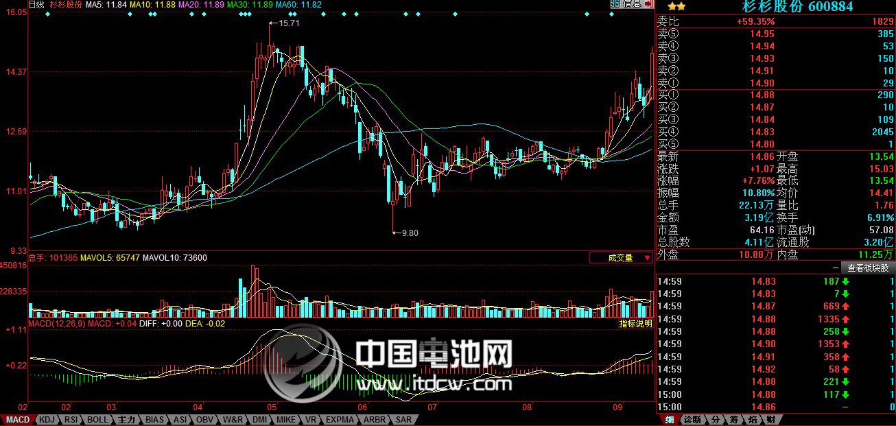 中國電池雜志-中國電池網(wǎng)9月24日訊(肖何 北京報道) 受新能源汽車補(bǔ)貼新政、特斯拉創(chuàng)新高等利好因素影響,前期回調(diào)休整的鋰電池概念股今日再度放量上攻,尾盤收盤德賽電池(000049)大漲8.18%,收盤價為61.63元,杉杉股份(600884)大漲7.76%,午后一度將觸及漲停,尾盤收在14.86元。成飛集成(002190)、佛塑股份(000973)漲幅超過2%,電動自行車概念澳柯瑪(600336) 漲幅為6%。