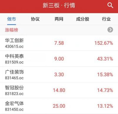 做市轉讓漲幅前五