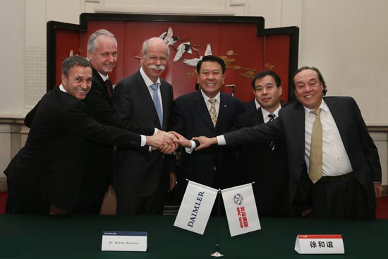 戴姆勒股份公司是全球最成功的汽車企業之一,擁有超過125年的汽車制造歷史。戴姆勒和北汽已建立了長期互信的戰略合作伙伴關系,實現了雙方乃至中國汽車行業的共贏。北京奔馳作為雙方的合資制造企業,從2006年開始生產國產梅賽德斯-奔馳乘用車;2013年,梅賽德斯-奔馳乘用車發動機工廠在北京奔馳正式投產,生產四缸和六缸發動機。這也是梅賽德斯-奔馳在德國以外建立的首個發動機工廠。雙方合資成立的北京福田戴姆勒汽車有限公司自2012年中期開始生產歐曼品牌中型和重型卡車。2013年3月,雙方合作又一具有里程碑意義的合資公司—北京梅賽德斯-奔馳銷售服務有限公司正式成立并投入運營。該公司將進口車和國產車的所有銷售和服務活動進行整合統一,為梅賽德斯-奔馳在華的可持續發展奠定基石。