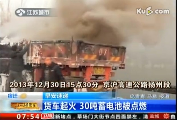 去年12月30日下午4點多,在京滬高速江都與高郵交界段,一輛裝滿廢舊電池的掛車,在行駛中發(fā)生火災(zāi)。