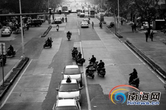 1月2日16時,海口海甸二路,一些超標(biāo)電動車在橫穿馬路。本組圖片由記者陳衛(wèi)東攝