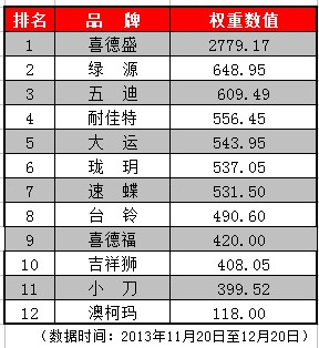 此次電商指數(shù)榜數(shù)據(jù)選取了電商平臺“雙11”、“雙12”兩大購物狂歡節(jié)所在的月份。針對2013年11月至12月份電動車品牌商在電商平臺上的銷售表現(xiàn)所做的綜合數(shù)據(jù)統(tǒng)計,并對各品牌在電商平臺所做的投入及曝光度的變化進行了動態(tài)評估。(由于銷售、上架量等數(shù)據(jù)均來源于電商平臺真實的數(shù)據(jù),會存在部分因電商平臺自身統(tǒng)計呈現(xiàn)未及時等原因而出現(xiàn)的數(shù)據(jù)誤差,不影響榜單在權(quán)重設(shè)置下的綜合數(shù)值)