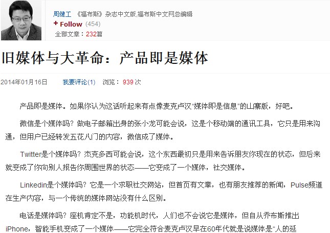 Linkedin是個(gè)媒體嗎?它是一個(gè)求職社交網(wǎng)站,但首頁(yè)有文章,也有朋友推薦的新聞,Pulse頻道在生產(chǎn)內(nèi)容,與一個(gè)傳統(tǒng)的媒體網(wǎng)站沒(méi)有什么區(qū)別。