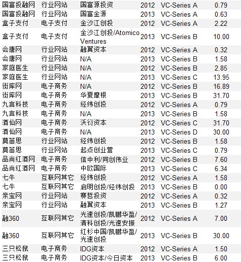 從具體案例看,2013年互聯(lián)網(wǎng)行業(yè)VC/PE融資的228起案例中,有39家企業(yè)曾在2012年內(nèi)年完成過融資(見表1)。其中,盛大文學(xué)在2012年和2013年分別獲得來自O(shè)rbis 150萬美元的PE-Growth融資和高盛、淡馬錫1.1億美元的PE-Growth投資,成為2012-2013國內(nèi)互聯(lián)網(wǎng)行業(yè)企業(yè)VC/PE連續(xù)融資案例中交易規(guī)模最大的企業(yè)。