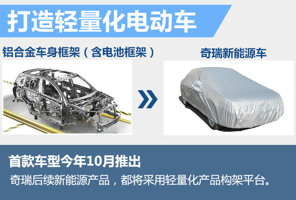 奇瑞汽車股份有限公司總經理助理劉志佳此前表示,奇瑞后續的新能源汽車產品,都是以鋁合金框架(含電池鋁合金框架)和分體式碳纖維于一體的輕量化產品構架平臺。今年10月,奇瑞將推出該輕量化平臺打造的首款車型,車身減重將達到30%,該車型的推出會為減排起到很大作用,同時新車的制造過程對于傳統四大工藝(沖壓、焊裝、涂裝、總裝)也將是很大的挑戰。新車有望由奇瑞新電動車工廠生產。