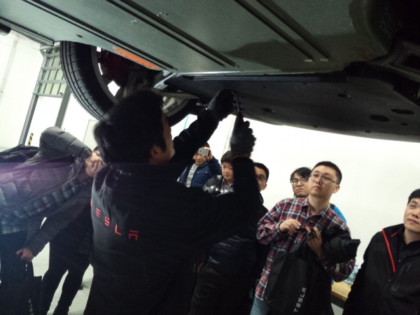 在用升降架升起一輛Model S后,維修人員向我們展示了用于保護電池組的底盤鋼板,而在鋼板前部還嵌入了結(jié)實的防撞梁,這是自特斯拉因撞擊導(dǎo)致鋰電池起火事故后增加的技術(shù),這些防護設(shè)計使Model S通過了美國和歐洲最嚴苛的安全測試。