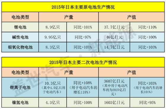「蓋世汽車·新能源」獨家報道,2015年1-12月,日本電池(包括原電池和二次電池)總產(chǎn)量超過43億只,總產(chǎn)值逾8075億日元(約463億元人民幣),產(chǎn)量和產(chǎn)值與上年同期相比均實現(xiàn)101%的增長幅度。