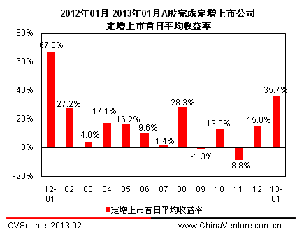 定向增發收益方面,根據ChinaVenture 投中集團統計顯示,2013年1月完成定增的20家上市公司定增上市首日平均收益率*為35.7%,較上月有所回升(見圖3、表3)。