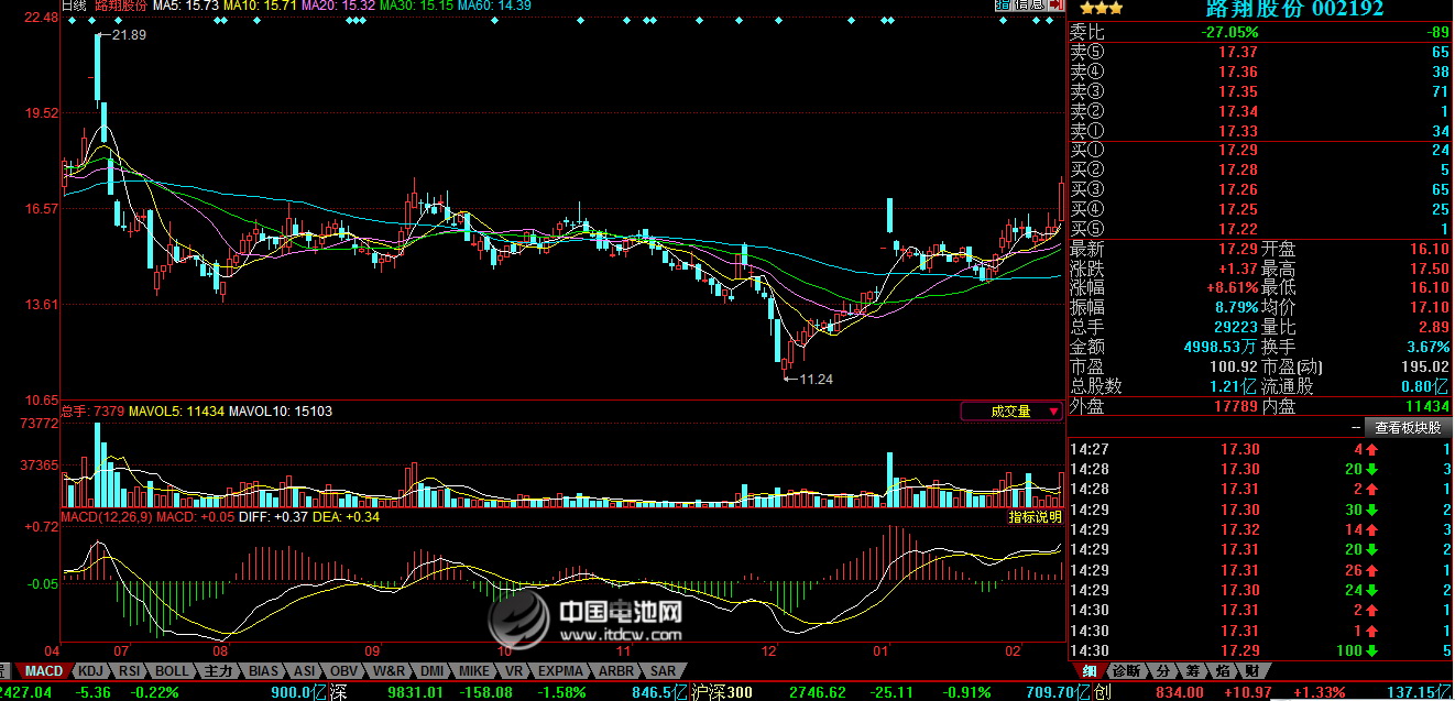 【本網訊】2月18日,蛇年股市開盤,鋰電池板塊再次受到資金面關注。領頭羊路翔股份(002192)強勢上揚,開盤16.10元,截止到14:16收在17.33元,漲幅為8.86%。消息面上,春節期間,智利、秘魯和玻利維亞連降暴雨且暴發洪水災害,甚至連全球最干旱的阿塔卡瑪沙漠地區,也遭到暴雨襲擊。而該地區是全球最大的兩個鹽湖提鋰生產企業主要原材料來源地,兩家企業合計占全球鋰鹽市場的半壁江山。