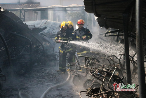 根據現場情況,消防官兵迅速鋪設水帶架設水槍,1小時后,大火徹底被撲滅,但現場的電動車已被燒毀了300余輛,只剩下骨架。