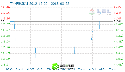 3月22日工業級碳酸鋰商品指數為109.08,與昨日持平,較周期內最高點112.10點(2012-11-04)下降了2.69%,較2012年01月05日最低點98.94點上漲了10.25%。(注:周期指2011-09-01至今)