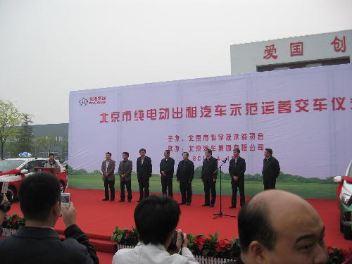 有著流線型車型、身穿白紫色相間“外衣”的“電的”在穿行的車流中特別搶眼,大興區是北京第七個開展電動出租車區域示范運營的遠郊區縣,如今有100輛電動出租車跑在大興街頭,這些車是由北汽新能源電動出租車公司在去年12月底投入運營的。