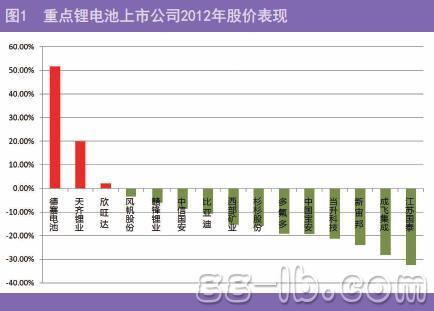 整體A股上市公司走勢萎靡不振,鋰電池概念股在2012年卻呈現(xiàn)兩極分化,德賽電池(000049.SZ)上漲幅度超過50%,天齊鋰業(yè)(002466.SZ)漲幅接近20%;當(dāng)升科技(300073.SZ),新宙邦(300037.SZ),成飛集成(0020190.SZ),江蘇國泰(002091.SZ)等跌幅超過20%。