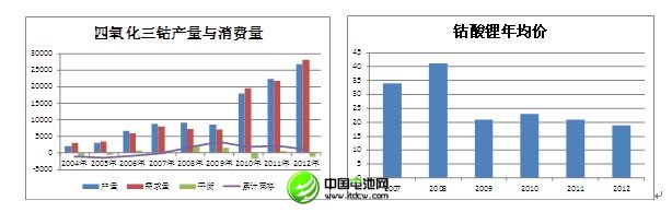 鈷酸鋰的上游原材料主要是四氧化三鈷,據浙江某大型四氧化三鈷廠商2012年的產量統計顯示,2012年全年其四鈷銷量達5100噸以上,同比增長超過50%,躍居國內首位,在全行業供應過剩、下游需求放緩的大背景下,四鈷不得不說是個實足的亮點。