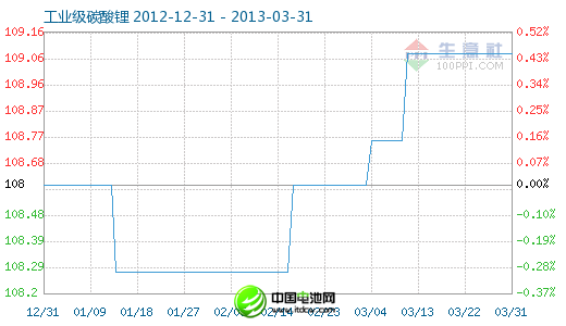 3月31日工業(yè)級碳酸鋰商品指數為109.08,與昨日持平,較周期內最高點112.10點(2012-11-04)下降了2.69%,較2012年01月05日最低點98.94點上漲了10.25%。(注:周期指2011-09-01至今)