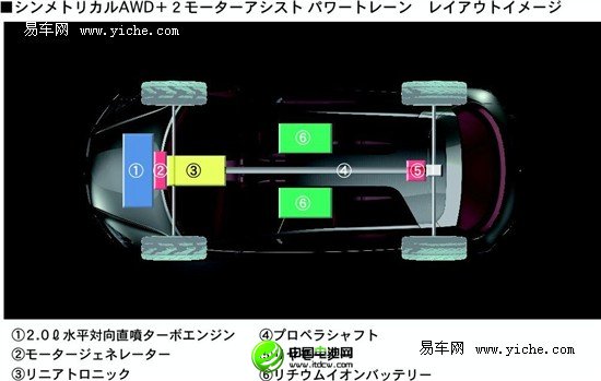 斯巴魯混合動力概念車搭載了一臺2.0L水平對置直噴汽油發動機,并在車的前部和后部分別配備了一臺10kW和20kW的電動機,而位于前部的發電機將作為車輛電氣系統的電源,且汽油發動機主要與后方電動機配合工作,無需前部發電機提供動力。