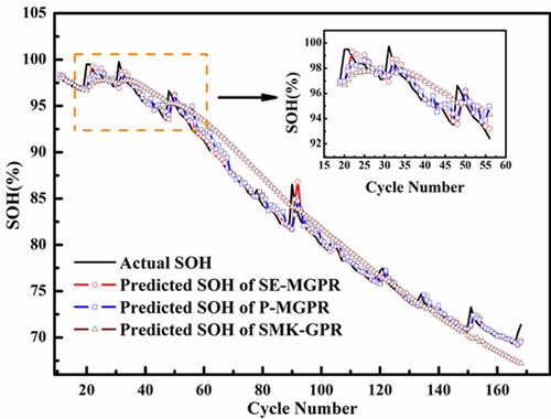 他們還創(chuàng)新性地提出了一種多尺度高斯過程模型框架,它能解耦全局的容量衰減趨勢以及局部的容量再生與波動,可同時實現(xiàn)鋰離子電池SOH的短期和長期精確預(yù)測,為電池的荷電狀態(tài)(SOC)估計和剩余可用壽命(RUL)預(yù)測奠定了堅實的理論和方法基礎(chǔ)。運用所提出的方法對美國宇航局(NASA)艾姆斯卓越預(yù)測中心三款標(biāo)準(zhǔn)電池數(shù)據(jù)進行擬合,結(jié)果表明可自適應(yīng)地解構(gòu)鋰離子電池的長期容量衰減、短期容量再生和波動等多種類型的趨勢,極大提高了模型的預(yù)測性能。