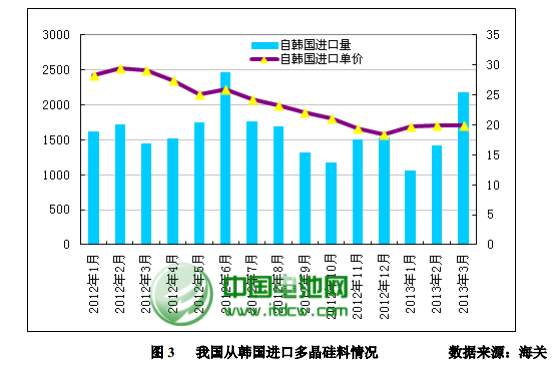 2013 年 3 月份從韓國進口多晶硅量增至 2184 噸,環比大幅上漲 53.6%;進口單價微幅回升至 19.88 美元/千克,環比增幅為 0.05%。2013 年 3 月自韓國進口單價延續 2 月漲勢繼續緩步回升。