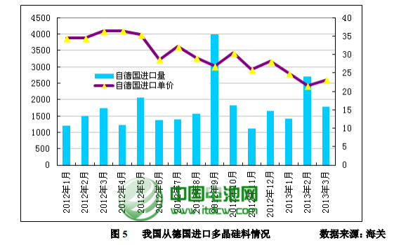 據最新海關統計數據顯示,2013 年 3 月我國多晶硅進口量為6433 噸,環比下滑 19.49%,同比大幅下滑 15.93%;進口單價方面,3 月份多晶硅進口均價較 2 月有所反彈,亦是 2013 年以來首次回升,為 19.39 美元/千克,環比增長 9.55%,同比下降 31%,較 2012 年全年均價下滑 23.5%。