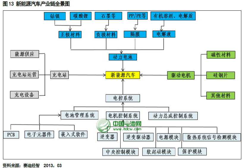 從產(chǎn)業(yè)鏈的角度來講,新能源汽車產(chǎn)業(yè)往上可延伸到鋰、稀土、鎳、錳等金屬礦產(chǎn)資源,往下包含新能源汽車整車運(yùn)營及服務(wù)等環(huán)節(jié)。其中整個(gè)產(chǎn)業(yè)鏈包含高性能電池材料(正極材料、負(fù)極材料、隔膜、電解液)、動(dòng)力電池、電池管理系統(tǒng)、驅(qū)動(dòng)電機(jī)、稀土永磁材料、汽車控制系統(tǒng)、充電站、充電設(shè)備等細(xì)分環(huán)節(jié)。