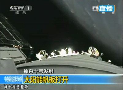 神舟十號飛船進入預(yù)定軌道,太陽能帆板展開。