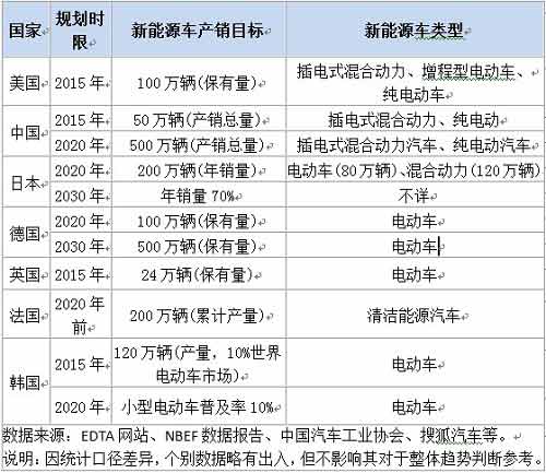 從各國的規劃時限來看,美國、中國、英國和韓國均提出了較為近期的產銷目標——5年內的產銷總量或保有量。這一定程度上體現了這些國家在發展新能源汽車方面較為迫切的態度。而日本、德國和法國在對產業政策規劃的時限上設定較晚,定在了2020年,日本更是給出了2030年的具體銷售目標。這為幾個國家國內新能源產業的發展預留了時間和空間。