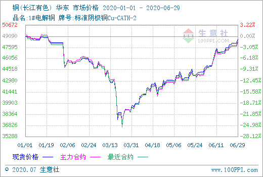 如上圖顯示,2020年上半年,銅市先下跌后上揚(yáng),走出“深V”走勢(shì),據(jù)生意社數(shù)據(jù)監(jiān)測(cè),年初銅價(jià)49033.33元/噸,隨后跌至半年最低點(diǎn)3月23日的36560元/噸,跌幅達(dá)25.44%,然后一路反彈至6月底的48166.67元/噸,幾乎完全收復(fù)之前跌幅,較年初只小幅下跌1.77%。