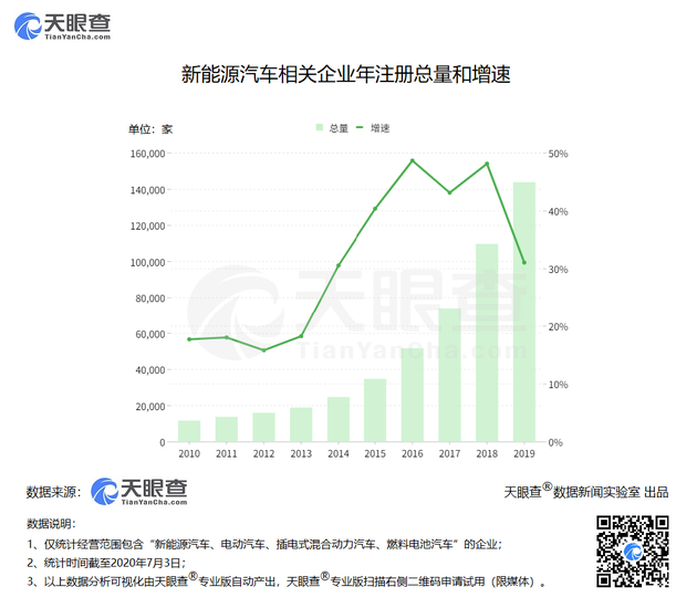 從成立時(shí)間來看,我國(guó)新能源汽車行業(yè)雖起步較晚,但發(fā)展迅速。天眼查數(shù)據(jù)顯示,我國(guó)新能源汽車相關(guān)企業(yè)注冊(cè)增速(全部企業(yè)狀態(tài))自2012年起保持穩(wěn)定增長(zhǎng),2016增速到達(dá)高峰,為48.7%,之后略有波動(dòng),2018年再次攀升至次高點(diǎn),全年新增新能源汽車企業(yè)超3.5萬家,為歷史新增最多年份。
