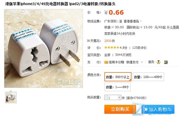 插頭和轉(zhuǎn)換器都可以在中國(guó)最大的網(wǎng)上商店淘寶網(wǎng)購(gòu)買,充電器價(jià)格從3.8元(0.62美元)到55元(9美元),轉(zhuǎn)換器價(jià)格從0.66元(0.1美元)到9.9元(1.6美元)。