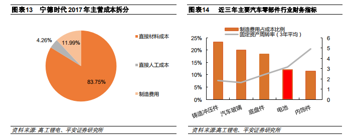單純從資本開支角度看,電池產業并不依賴固定資產投資,制造費用占成本比例大概為 12%,與汽車零部件其他行業相比,顯著低于汽車玻璃、底盤件等規模效應顯著的產業。