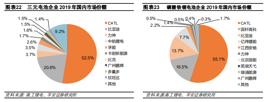 除寧德時代、比亞迪 2 家供應商在三元電池和磷酸鐵鋰路線均有較高的市場份額之外,其他競爭對手大多專注于一種技術路線,比如專注三元的力神、中航鋰電、孚能科技,專注磷酸鐵鋰電池的國 軒、億緯鋰能等。之前的動力電池供應商沃特瑪、比克電池等份額逐漸縮小,產能出清。動力電池 企業市場份額集中度高,其中三元和磷酸鐵鋰電池 CR3 分別為 76.8%,85.3%。