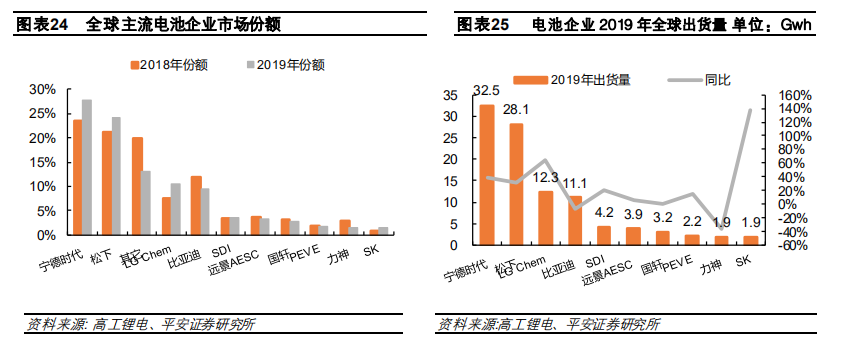 全球動力電池市場格局較為集中,TOP 3 品牌占市場份額 62.5%,其中寧德時代出貨量為 32.5Gwh,同比+38.9%,分析 2019 年市場,市場份額下滑的企業中以小型電池企業居多。