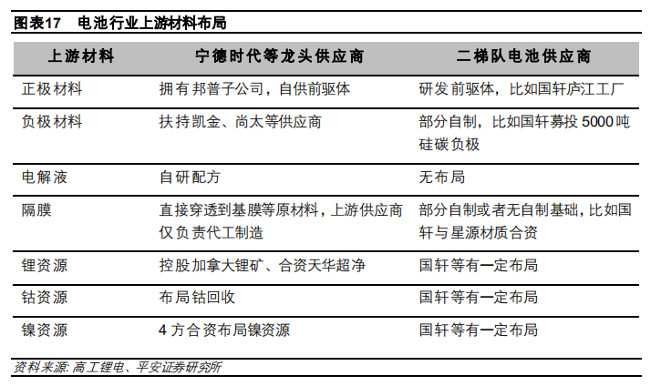 龍頭供應商掌握上游材料配方。在材料配方研發端及上游礦產資源端,CATL 在上游材料的采購價格具備較為顯著的優勢,主要在于寧德時代掌握了上游原材料的配方和制造工藝,并且擁有正極材 料自制工廠,另外布局了上游鎳、鈷、錳等礦產,從而整合了全產業鏈的利潤,中上游材料廠商有部分代工的性質。