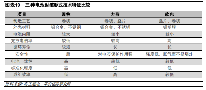 電池產品從產品形態上目前可以區分為三種,可分為圓柱、方形、軟包電池等,雖然材料配方一致, 但是使用不同的制造工藝,安全性、能量密度、穩壽命也各不相同。