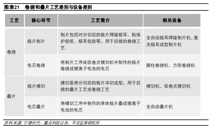 動力電池設備工藝更新需要大量再投資,單 GWH 設備(進口)再投資約 1.1 億元左右。方形電池既可以用卷繞工藝,也可以用疊片工藝,目前以卷繞工藝為主。工藝的不同,對應的設備也存在差 別,體現在:卷繞工藝包括極片制片和電芯卷繞兩道環節,需要用到制片機和卷繞機;而疊片工藝包括極片模切和電芯疊片兩道環節,需要用到模切機和疊片機。所以如果更換工藝需要涉及到產能 設備的重新更換和再投資。