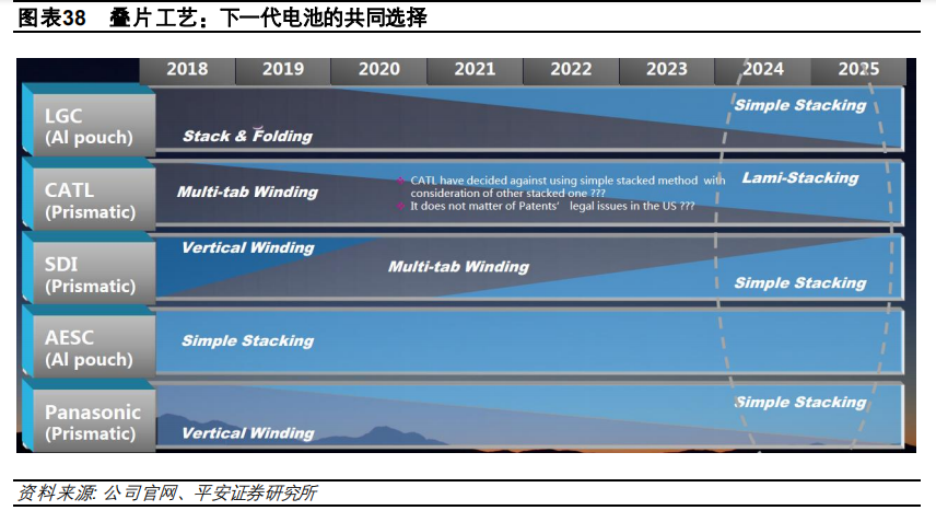 第二是與傳統(tǒng)卷繞工藝不同,在制造工藝上公司采用了疊片制造工藝,長(zhǎng)而薄的刀片結(jié)構(gòu)電芯散熱 性明顯提高,而且本身可以作為結(jié)構(gòu)件,疊加無(wú)模組技術(shù),可以使安全性更好、成本更低、體積能 量更高,預(yù)計(jì)將是未來(lái)動(dòng)力電池的主流發(fā)展方向。