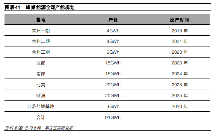 至 2025 年蜂巢國(guó)內(nèi)產(chǎn)能總規(guī)劃為 51GWh,建成產(chǎn)能 4Gwh,全球產(chǎn)能規(guī)劃約 91GWh,其中歐洲規(guī)劃 20GWH,北美規(guī)劃 20GWH。