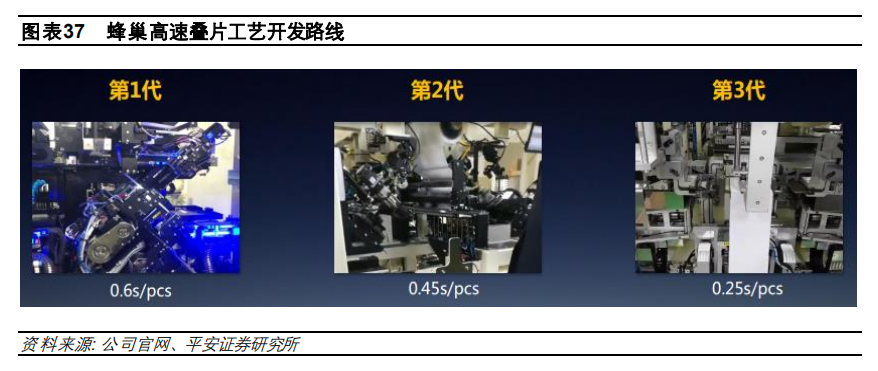 預(yù)計(jì)追平卷繞工藝生產(chǎn)效率的 0.25 s/pcs 的第三代疊片工藝將于 2023 年完成開發(fā),在制造設(shè)備上,公司采購(gòu)的是韓國(guó)的鋰電設(shè)備,第二代設(shè)備公司參與共同研發(fā),并且簽訂了排他協(xié)議,該設(shè)備 于 2020 年中即可投產(chǎn),效率將會(huì)提升至 0.45s/pcs 的水平,相比第一代生產(chǎn)效率提升25%。