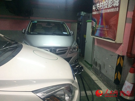 除了租車公司大面積占用公共充電點,一些汽油車以及不充電的新能源車占用充電車位的現象也很常見。在中關村鼎好電子商城地下車庫,共有6個充電車位,其中2個故障,一個車位被汽油車占了,2個車位被不充電的新能源車占了,兩位車主只能將車停在過道上,將充電線拉出來充電。