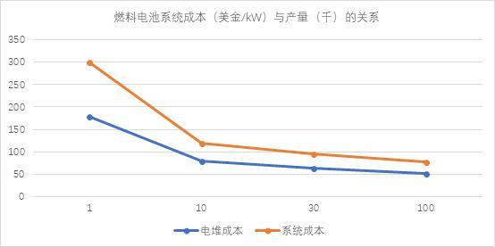 據美國能源部最新數據顯示,以80kW質子交換膜燃料電池系統為例,2017年,每生產1000套燃料電池,燃料電池系統(包括燃料電池電堆、高壓儲氫罐、升壓變頻器、電動機、動力控制單元等)的成本達到179美元/kW,其中電堆成本為118美元/kW;每生產1萬套燃料電池,燃料電池系統成本為79美元/kW,其中電堆成本為39美元/kW。