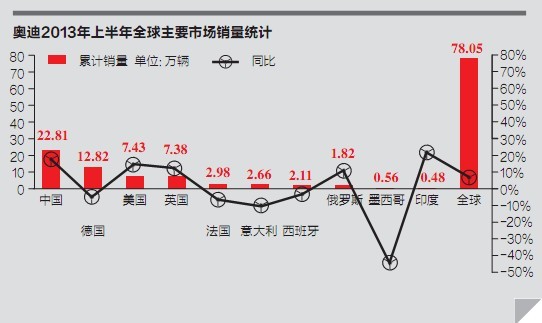 2013年上半年,奧迪中國(guó)市場(chǎng)銷量為22.8萬(wàn)輛,增長(zhǎng)17.7%。不僅保持了中國(guó)豪華車市場(chǎng)領(lǐng)軍者的地位,而且前進(jìn)步伐比競(jìng)爭(zhēng)對(duì)手更快——寶馬2013年上半年銷量同比增長(zhǎng)15%,奔馳則為負(fù)增長(zhǎng)。